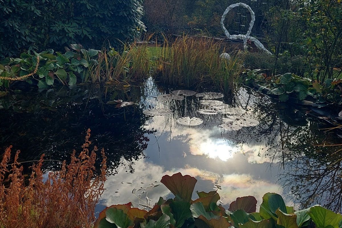 In einem gut eingewachsenen Garten mit Plätzen der Freude, mit einem Teich vor einer riesigen Rhododendronhecke und verschiedenen Hoch- und Gemüsebeeten genießen wir die Ruhe an verschiedenen Stellen, je nachdem ob wir Sonne oder Schatten suchen.