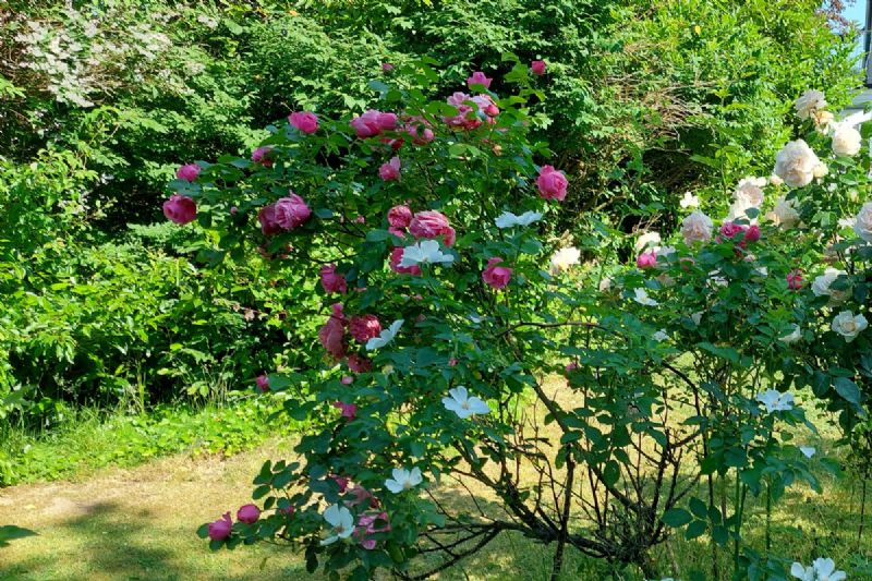 Der Weg vorbei am Haus lässt nur erahnen, welch ein Garten den Besucher erwartet: in viele Gartenräume unterteilte, romantische Pflanzungen, hier ein Pavillon, dort ein alter Obstbaum, mal sind Fundsachen vom Flohmarkt zweckentfremdet aber harmonisch in die vielfältigen Stauden eingebettet. Eine Vielfalt von Stauden, viele von der Gärtnerin aus Ablegern gezogen, teils in farblicher Harmonie aber auch in überraschenden Kombinationen zusammengepflanzt begleiten den Besucher auf seinem Rundgang. Eine Spezialität sind die verschiedenen Varietäten von Sempervivum, die vermehrt werden und in vielen kreativ zweckentfremdeten Gerätschaften Nischen beleben oder in kleinen Sammlungen präsentiert werden. Wichtig ist der Gärtnerin, dass Vögel und Insekten Nahrung finden und sie hat deshalb dafür gesorgt, dass immer etwas blüht oder fruchtet. Neuerdings beleben vier Hühner den Garten und picken tagsüber in einem großen Freilauf.